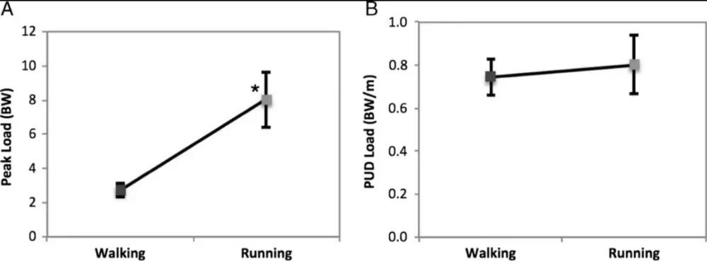 跑步和走路膝盖的峰值冲击力和单位距离负荷,图片来源:参考文献1